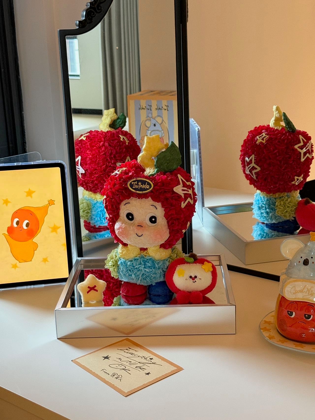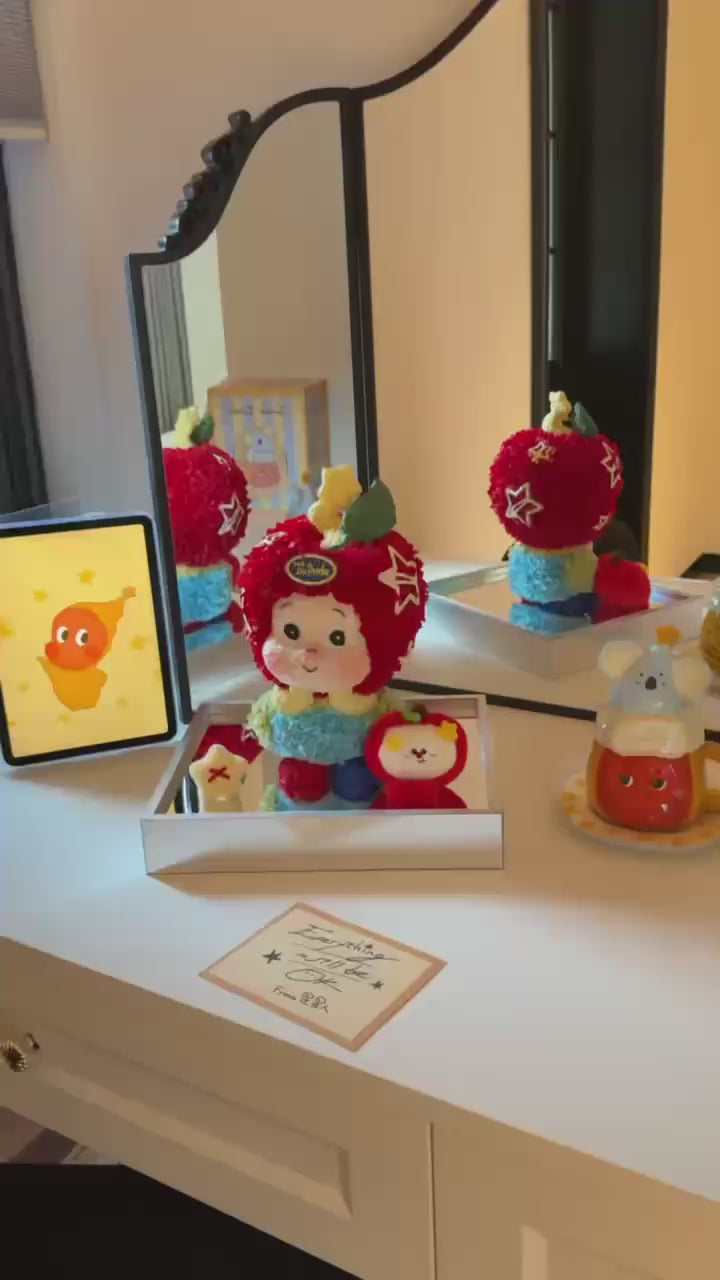 Dressed in a bright red apple hood sprinkled with stars, Apple of My Stars is a bundle of sweetness and joy. With its round cheeks, curious eyes, and a tiny apple buddy by its side, it feels like a pocket-sized guardian of happiness. Just like biting into a crisp apple, it brings a refreshing burst of cheer, reminding you to savor life’s simple moments and keep love close to your heart.