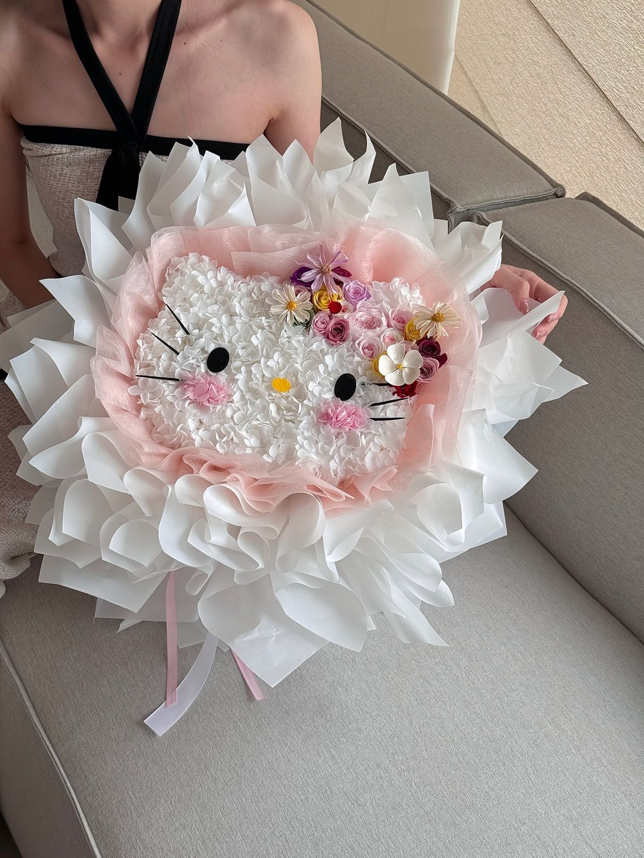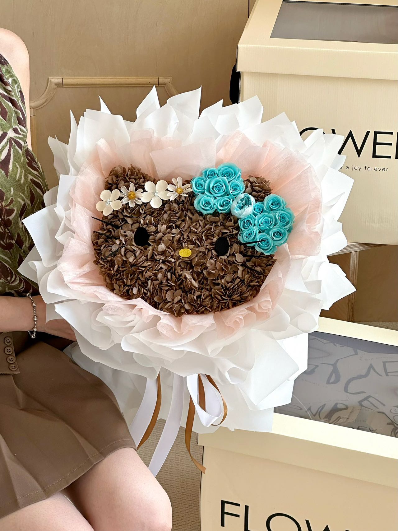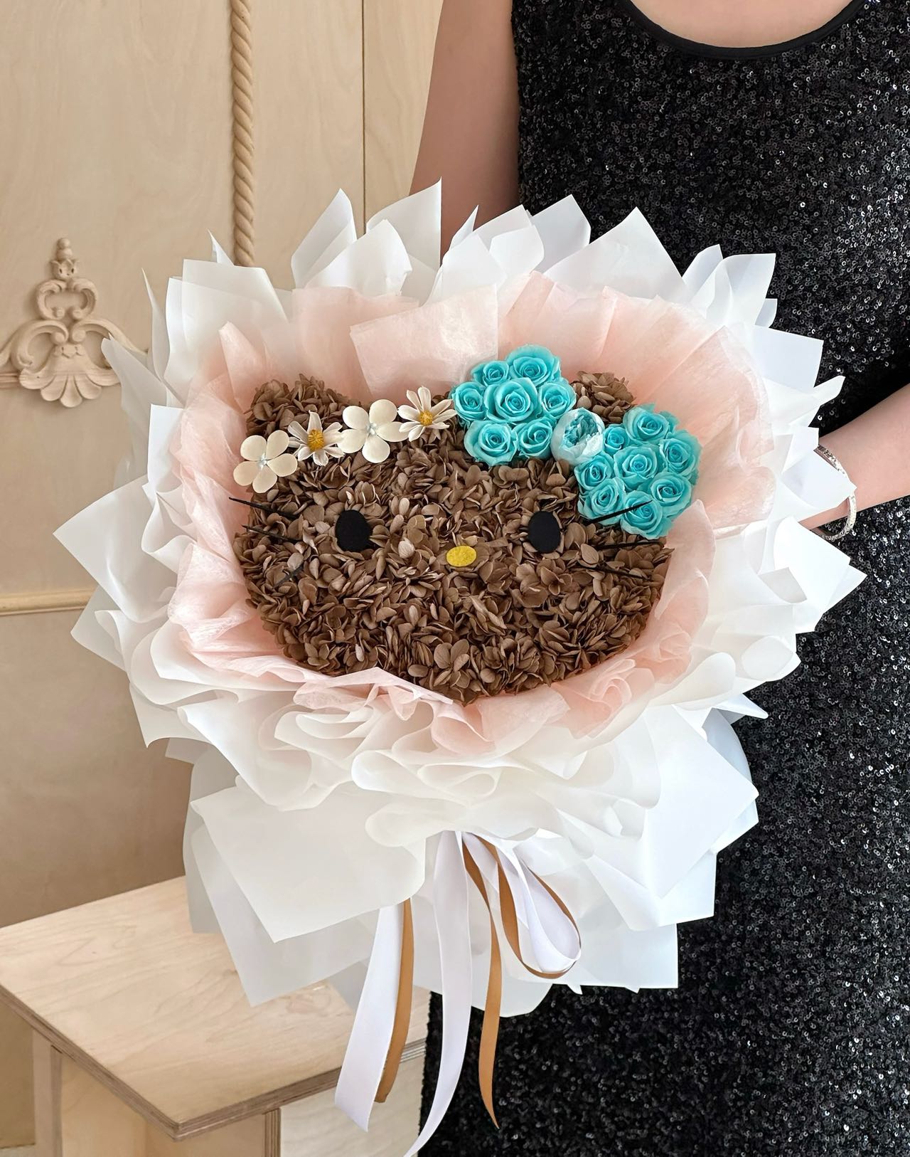 Soft as a whispered promise, Blooming Kitty Dreams blooms with the tender elegance of love. Shaped in delicate petals and crowned with blossoms in shades of blush and ivory, it carries the sweetness of a smile and the warmth of a gentle embrace. Each flower is carefully placed, symbolizing devotion that lingers and affection that never fades. It is a radiant declaration of love, more than a bouquet, meant to stay as timeless and beautiful as the one who receives it.