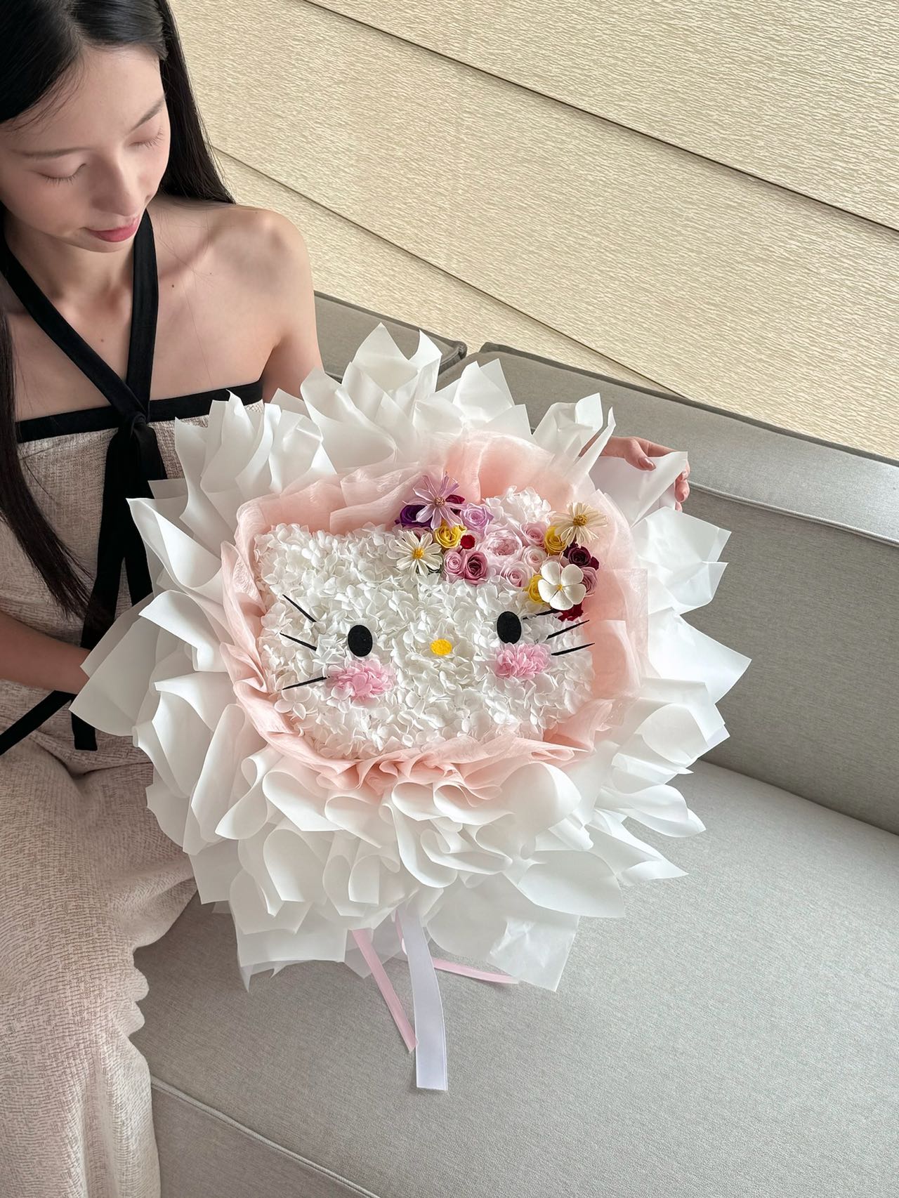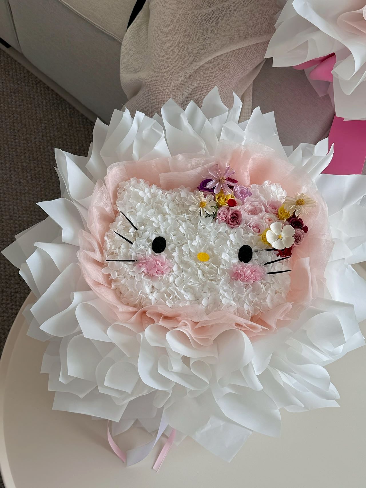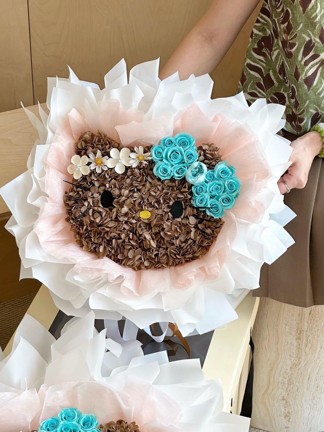 Soft as a whispered promise, Blooming Kitty Dreams blooms with the tender elegance of love. Shaped in delicate petals and crowned with blossoms in shades of blush and ivory, it carries the sweetness of a smile and the warmth of a gentle embrace. Each flower is carefully placed, symbolizing devotion that lingers and affection that never fades. It is a radiant declaration of love, more than a bouquet, meant to stay as timeless and beautiful as the one who receives it.