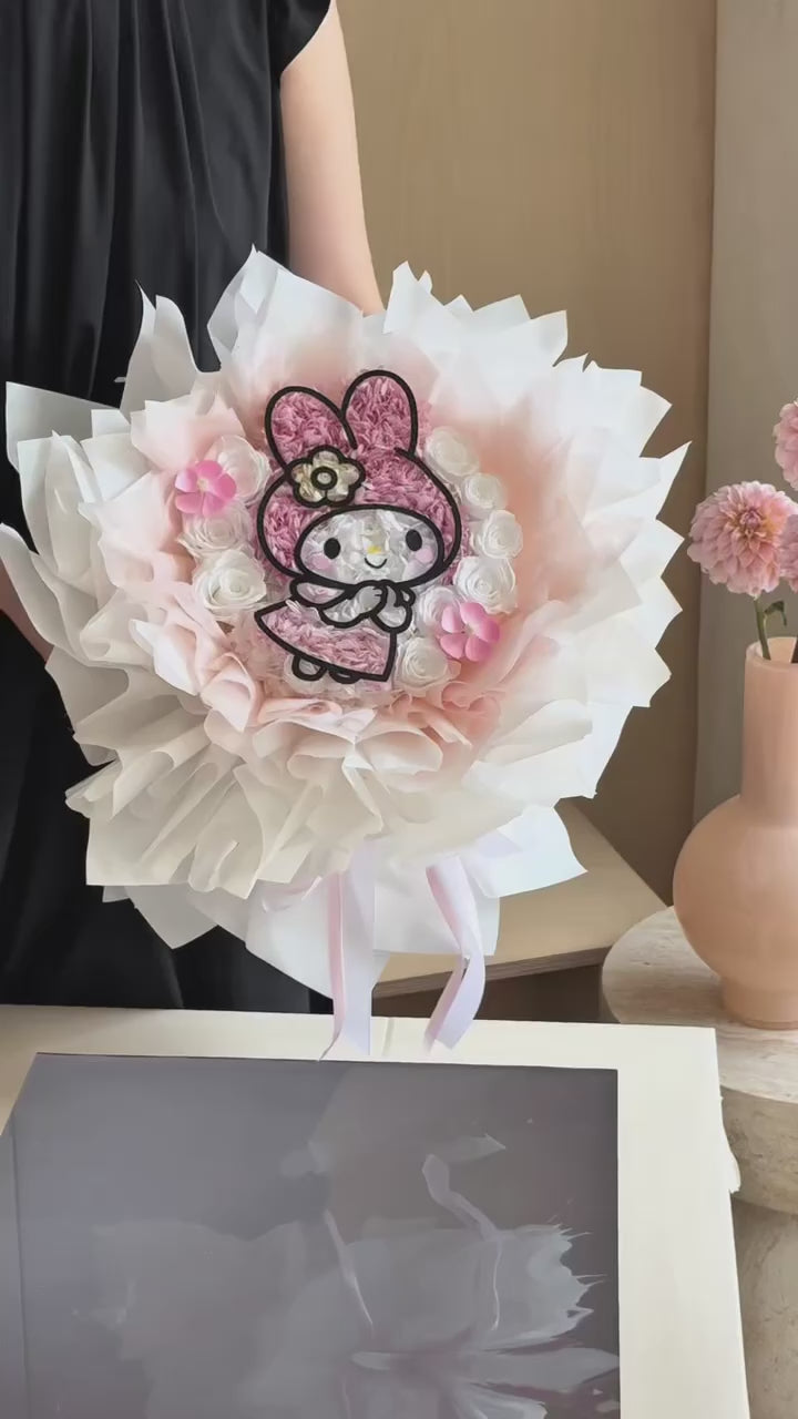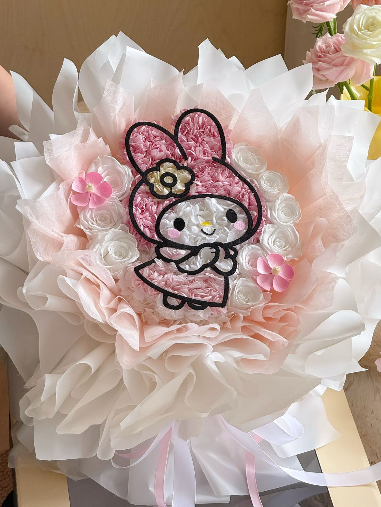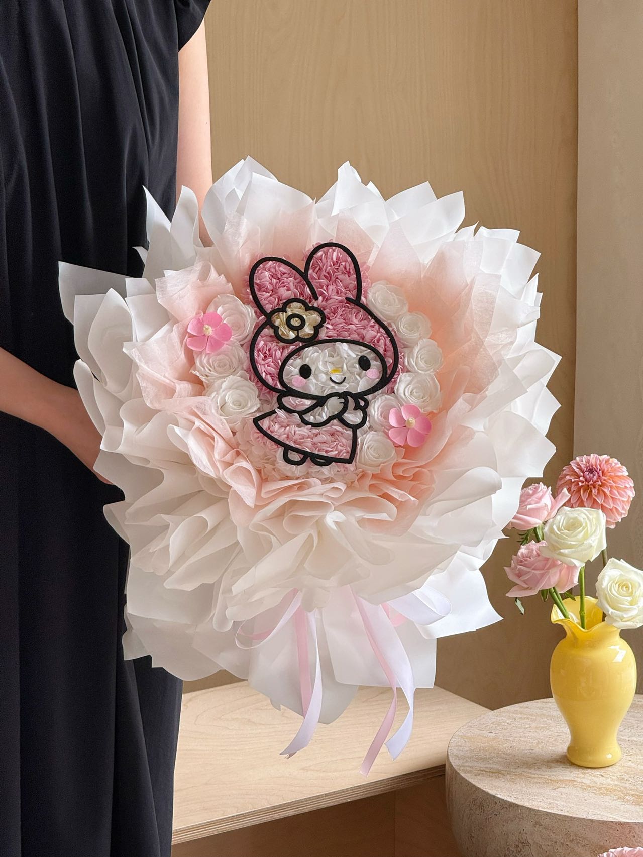 Blush Harmony is a delicate bouquet that blends playful sweetness with graceful charm. At its heart, soft pink and white blossoms are arranged into the beloved figure of My Melody, framed by layers of gentle blush petals and airy white wraps. The pastel tones flow together like a quiet melody, creating a sense of warmth, innocence, and joy. Perfect as a gift for someone dear, this bouquet embodies harmony, affection, and the soft beauty of young love.