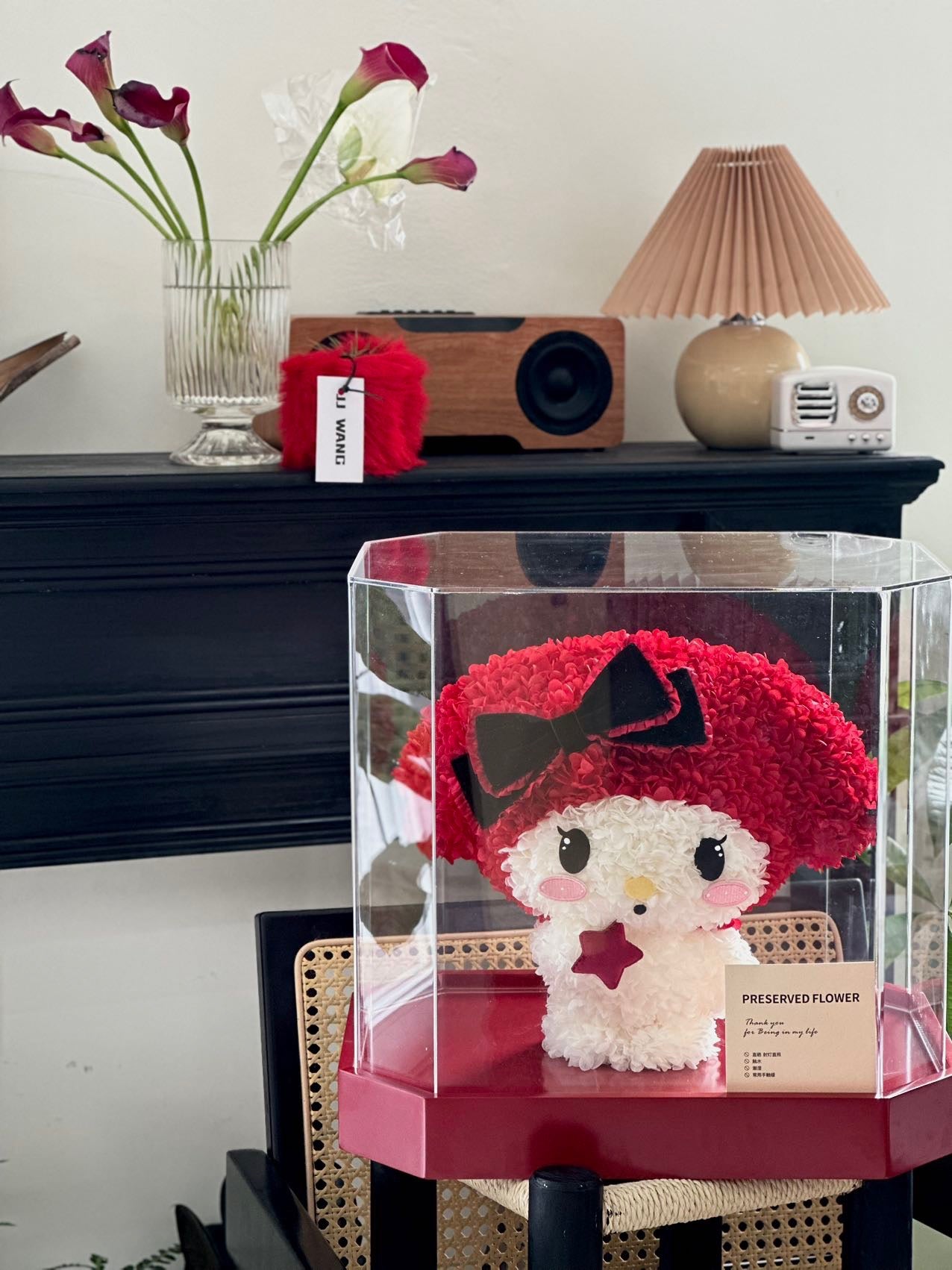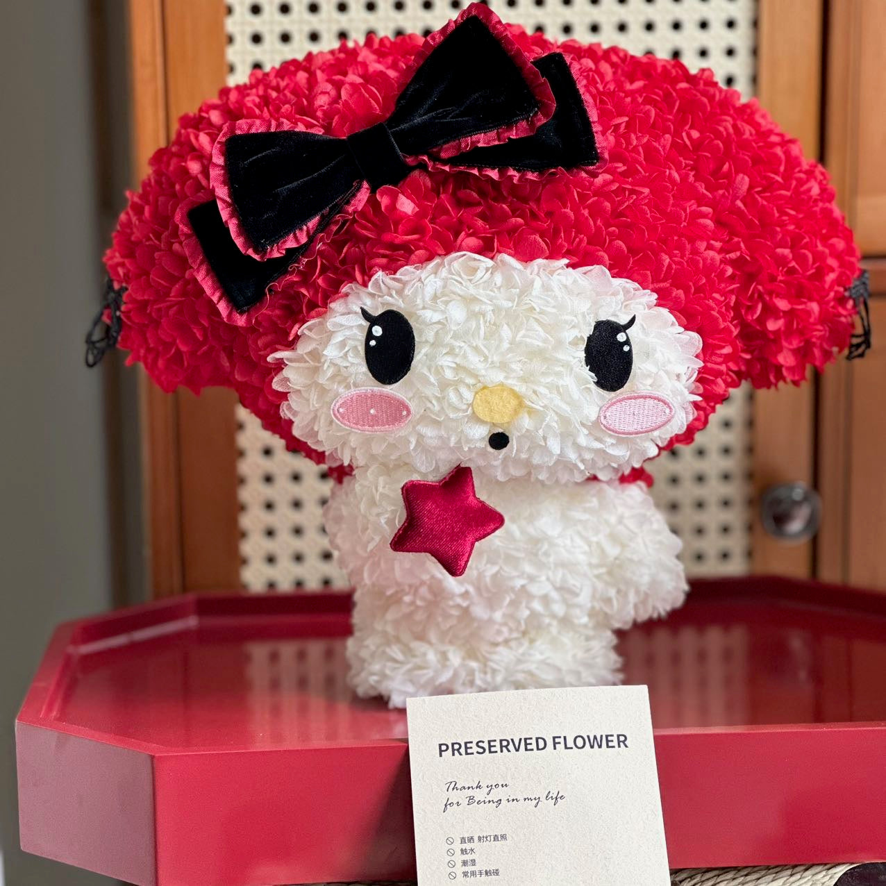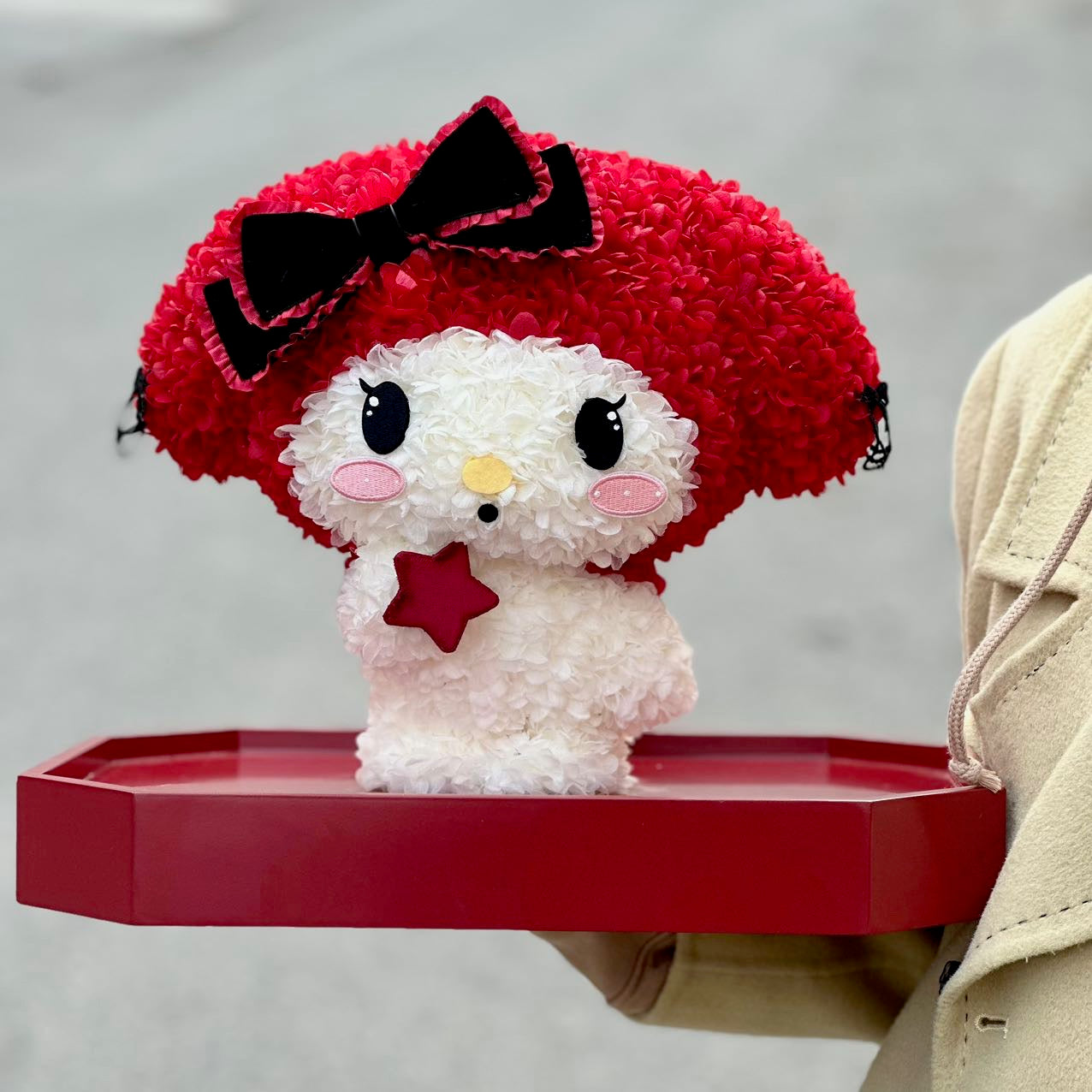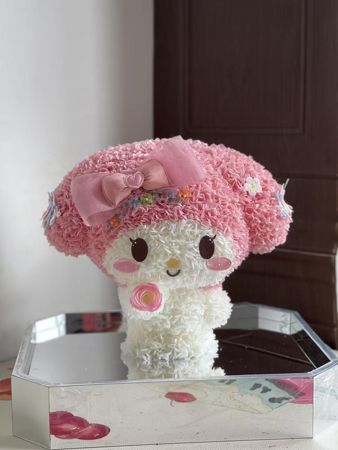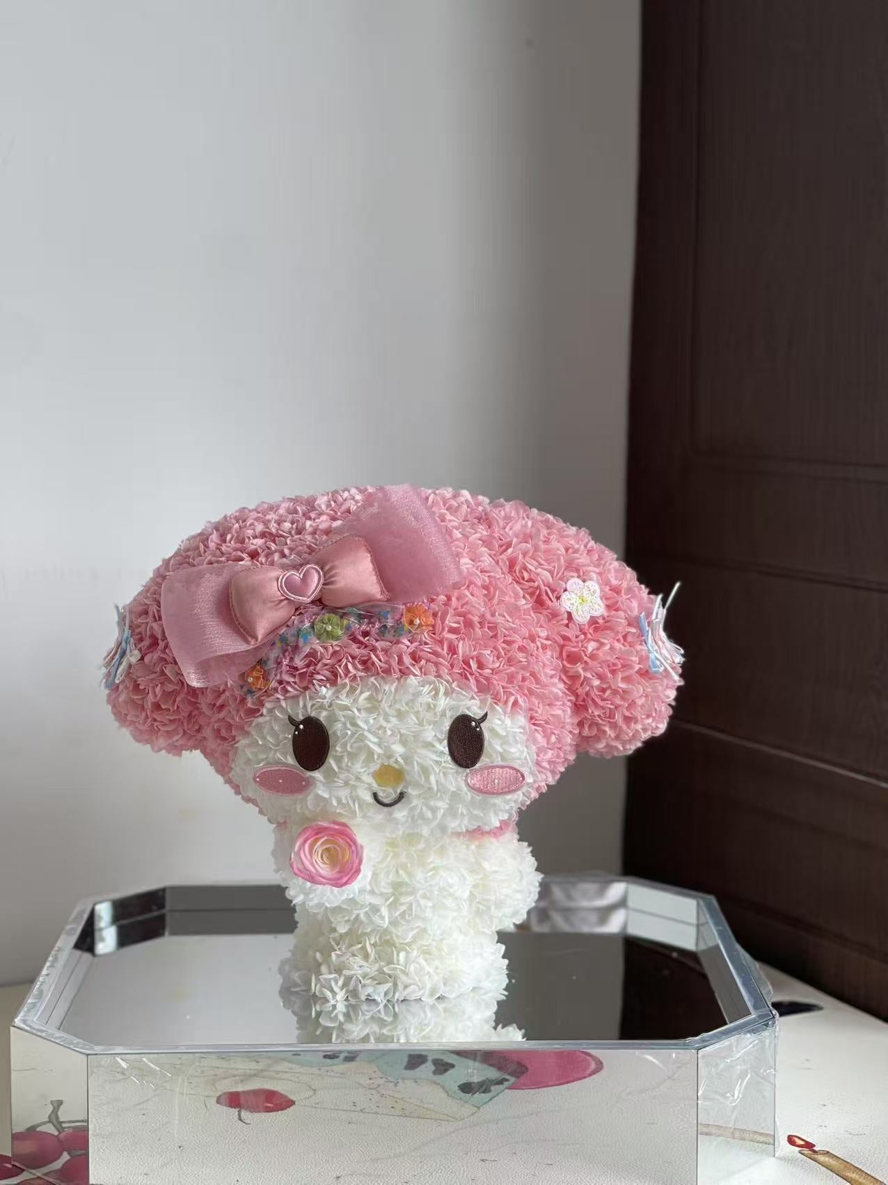 A tender bloom of pink and white petals shaped into the most adorable figure, crowned with a velvet bow and holding a tiny star close to its heart. Blush Stardust captures the innocence of first love and the warmth of gentle wishes whispered under the night sky. Perfect as a gift of romance, it speaks softly of affection, luck, and everlasting sweetness.