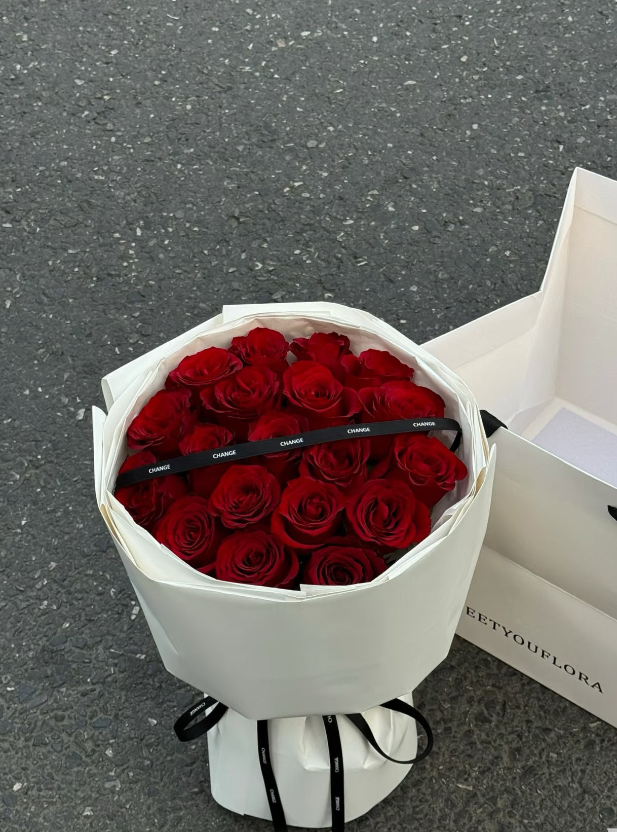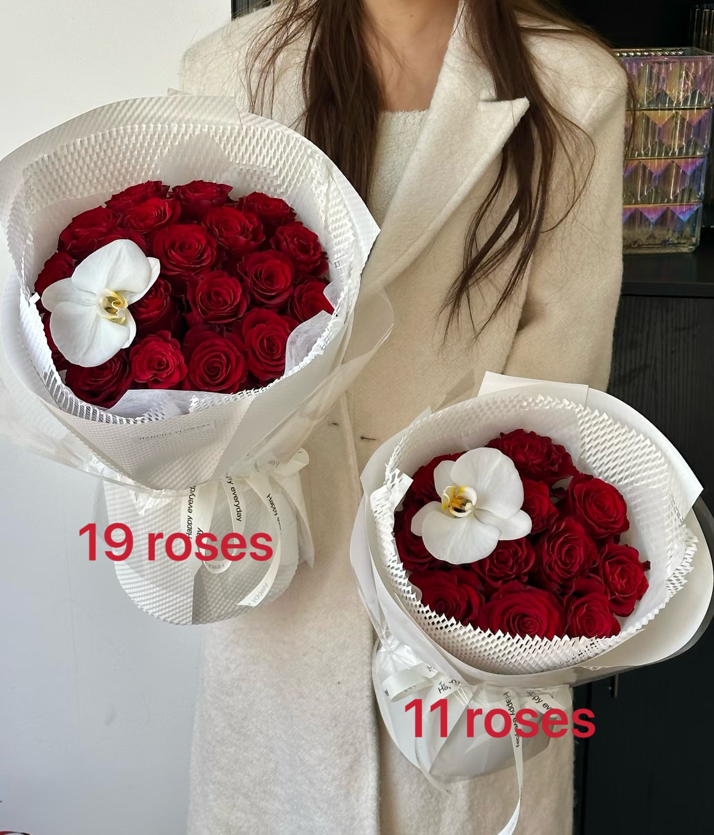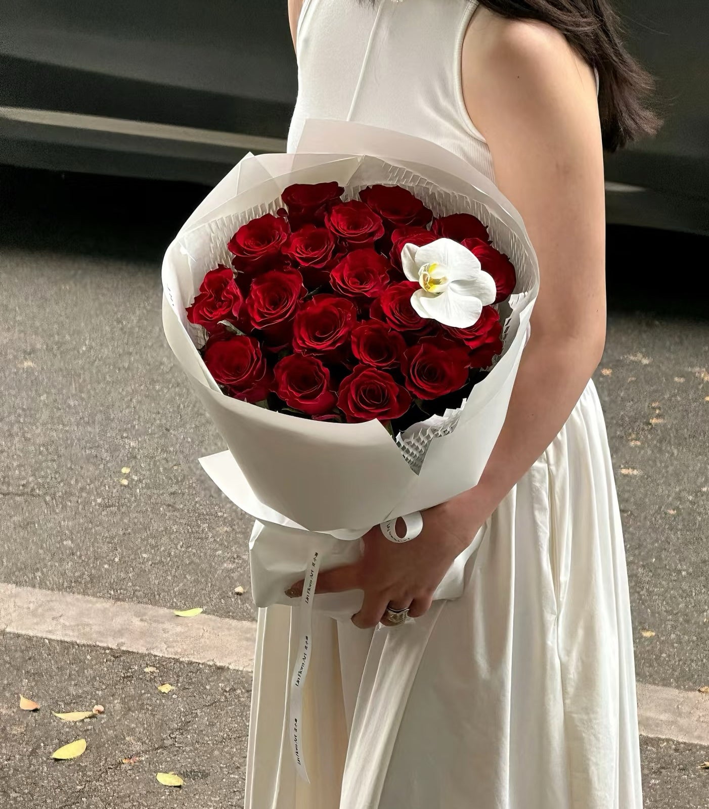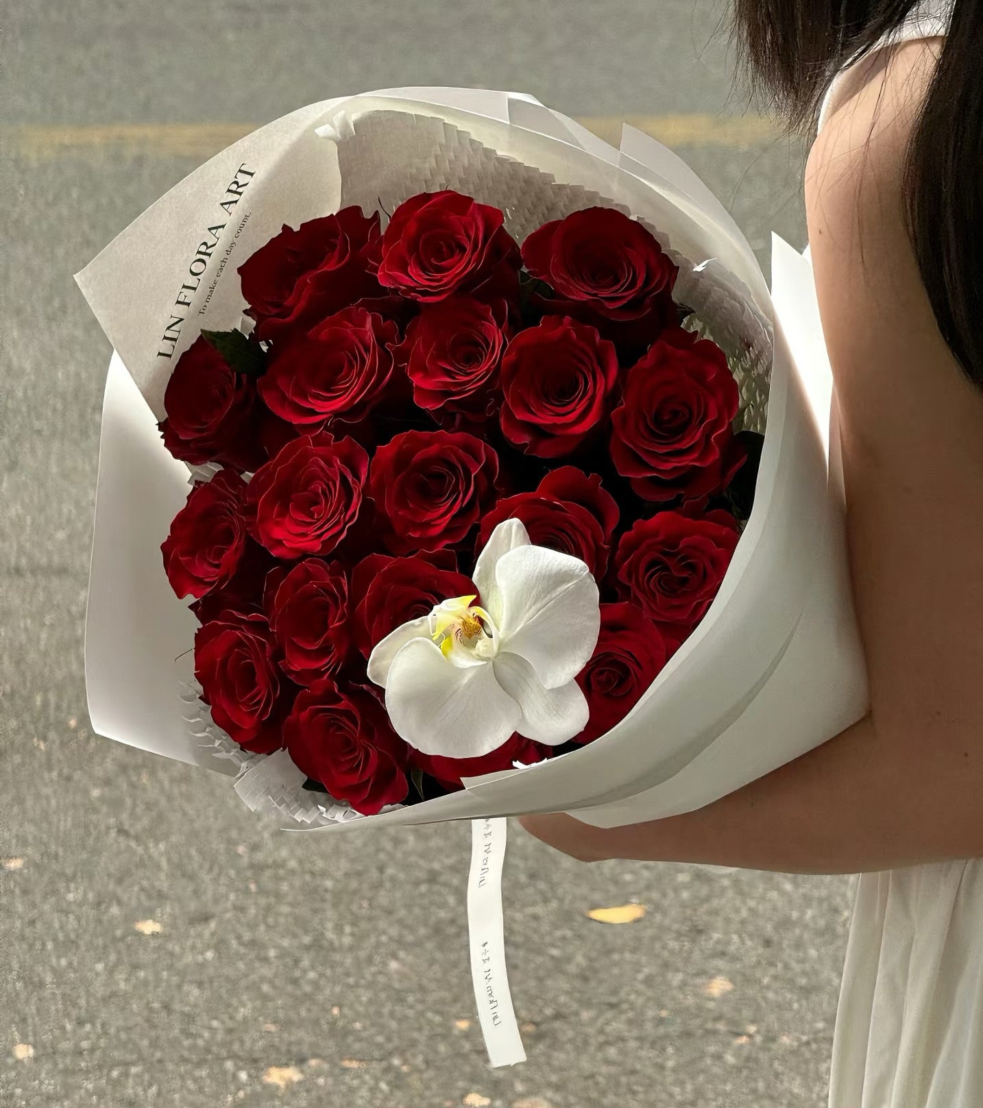 Sweet, bold, and impossible to forget. Cherry Kiss is a bouquet that speaks the language of affection with every petal. Twenty scarlet roses are whispering “I adore you,” sealed with a single white orchid, pure as the first heartbeat of love. It’s the perfect blend of charm and passion, wrapped in creamy elegance for the one who makes your world blush.