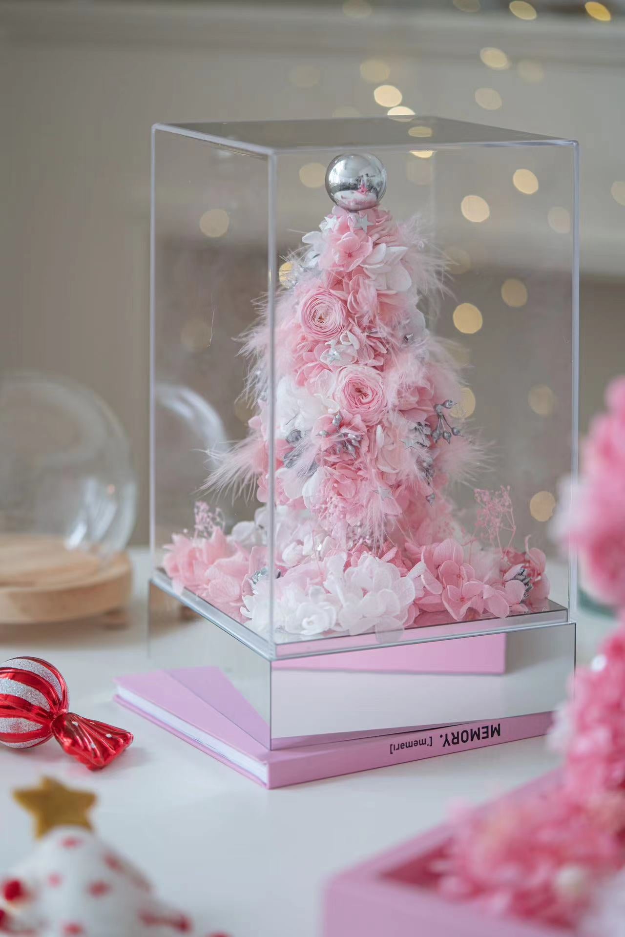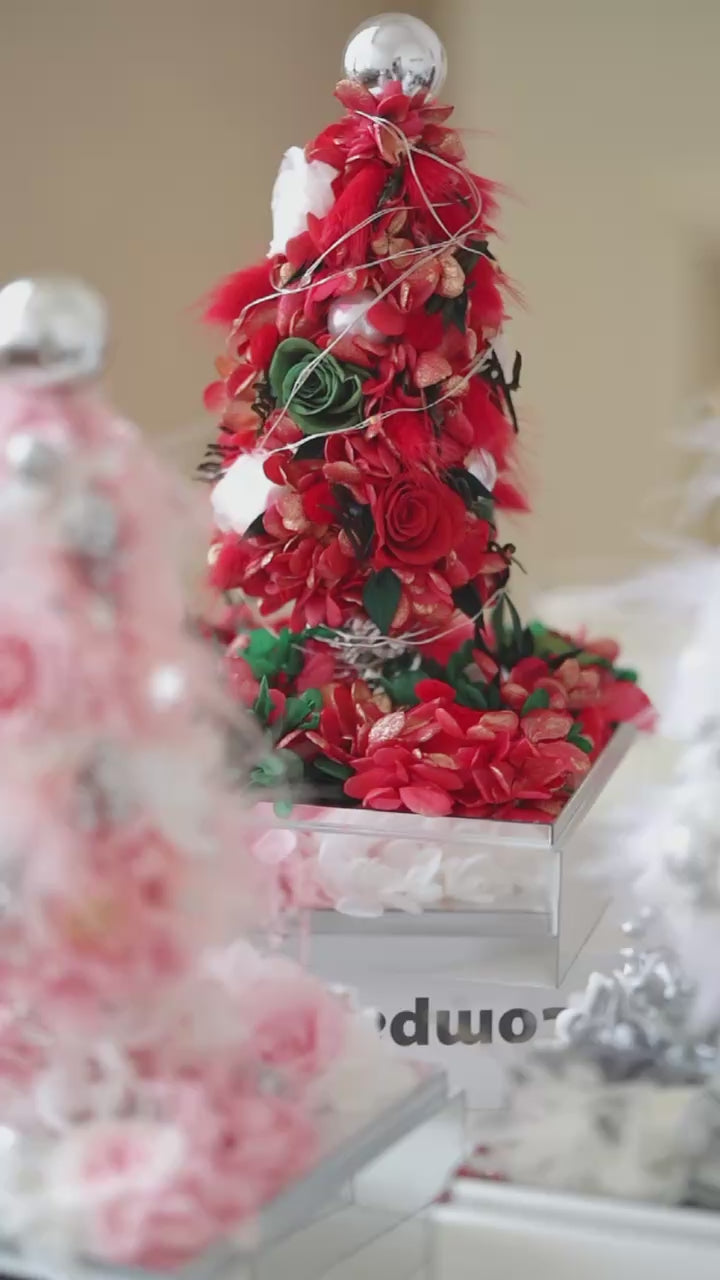 Wrapped in a crystal embrace, Crimson Whisper blooms like a secret kept close to the heart. Its deep red petals and evergreen roses intertwine with golden accents and twinkling lights, echoing the warmth of love in the winter night. More than a festive centerpiece, it is a symbol of devotion. The evergreen promise that glows as brightly as the season’s joy. Along the line, a gentle harmony of pink and white blooms the same sweet promise, capturing the softness of first love and the purity of winter’s embrace. Gift them as a keepsake of romance, and let their radiance whisper tenderness long after Christmas fades.