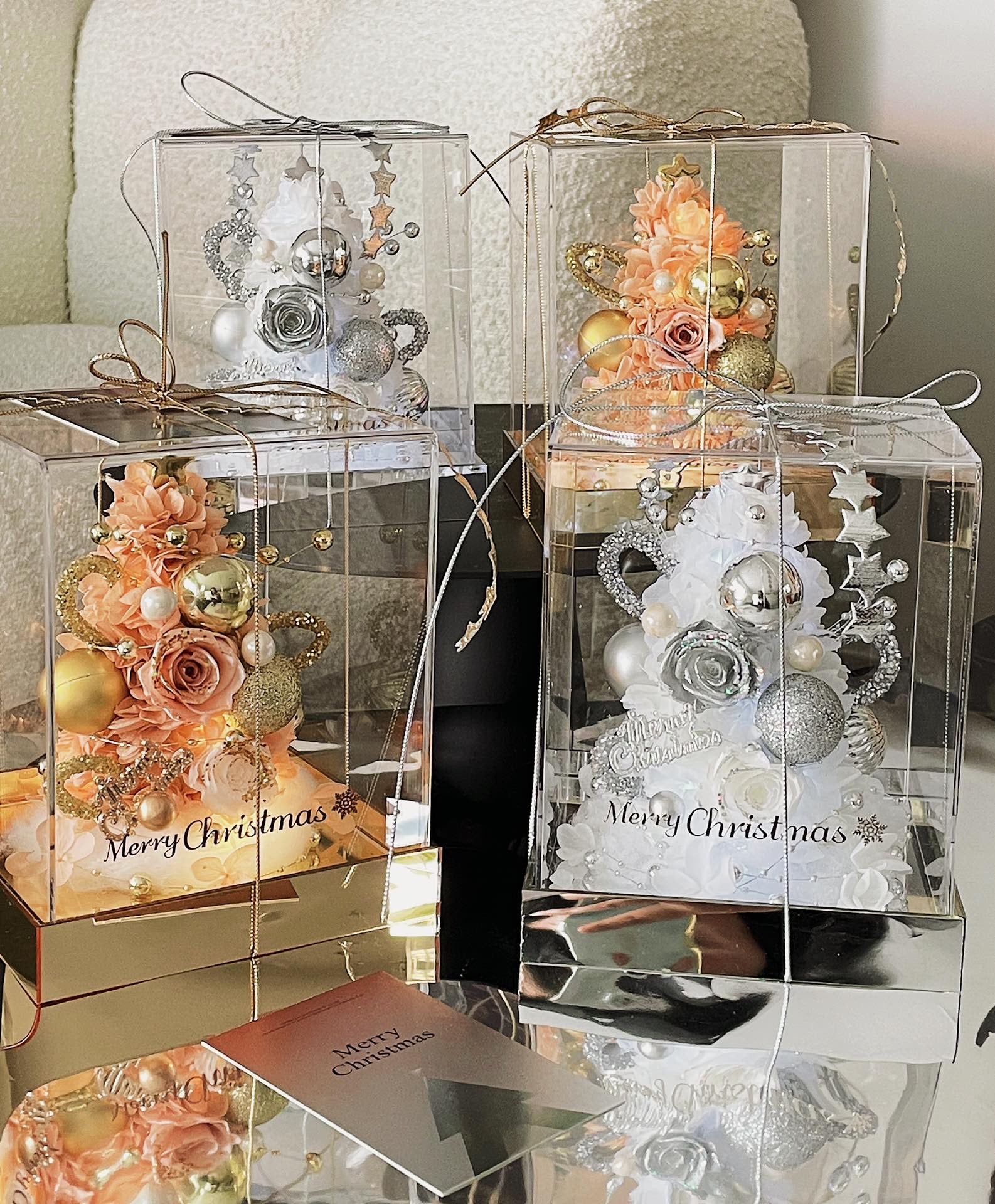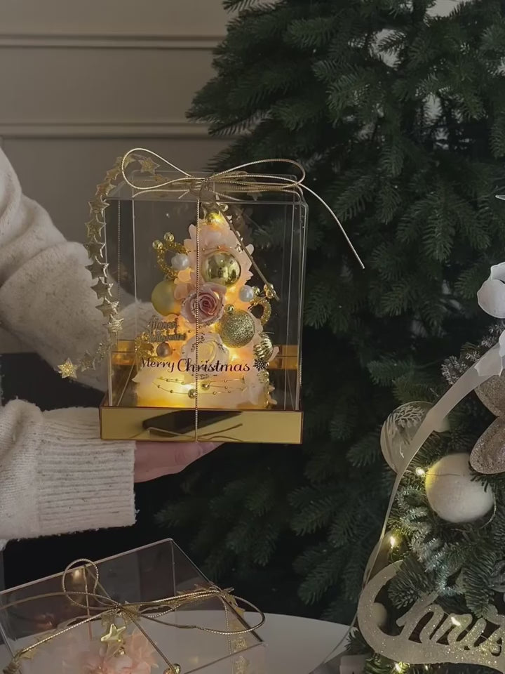 Encased in a crystal-clear box and crowned with delicate ribbons, Eternal Noel is more than a Christmas ornament. Each tree is adorned with preserved roses, shimmering ornaments, and a constellation of silver and gold accents, radiating warmth against the winter chill. Softly glowing with festive light, it carries the promise of everlasting beauty and a love that endures beyond seasons. A gift to cherish, a keepsake to treasure, Eternal Noel transforms any space into a storybook of holiday magic and tender memories.