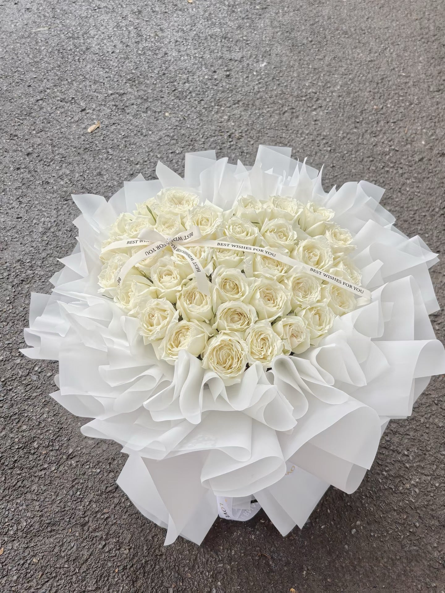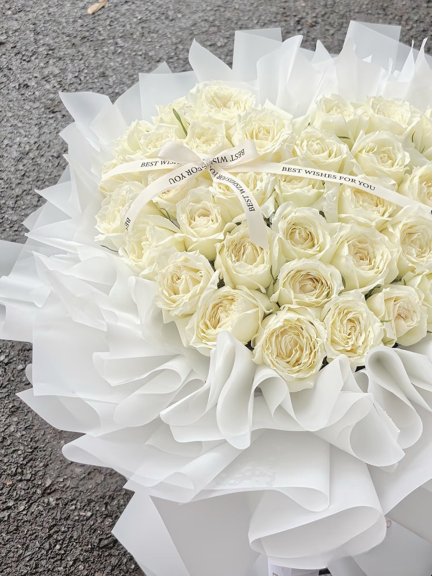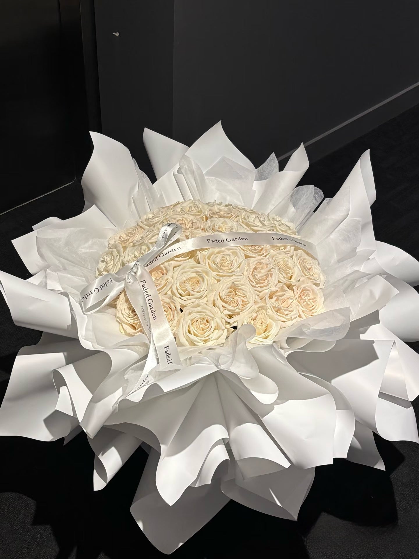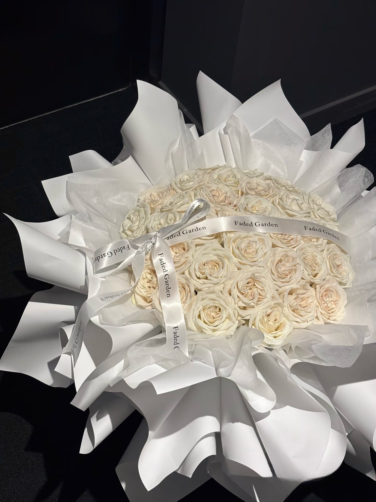 Pure as the first snow, soft as a promise that never fades. Eternal White gathers white roses in their quiet splendo. Each petal is a love letter left unspoken, each stem is a vow that endures. It’s a bouquet that carries the stillness of purity and the warmth of everlasting devotion, where love remains as gentle and radiant as the day it began.