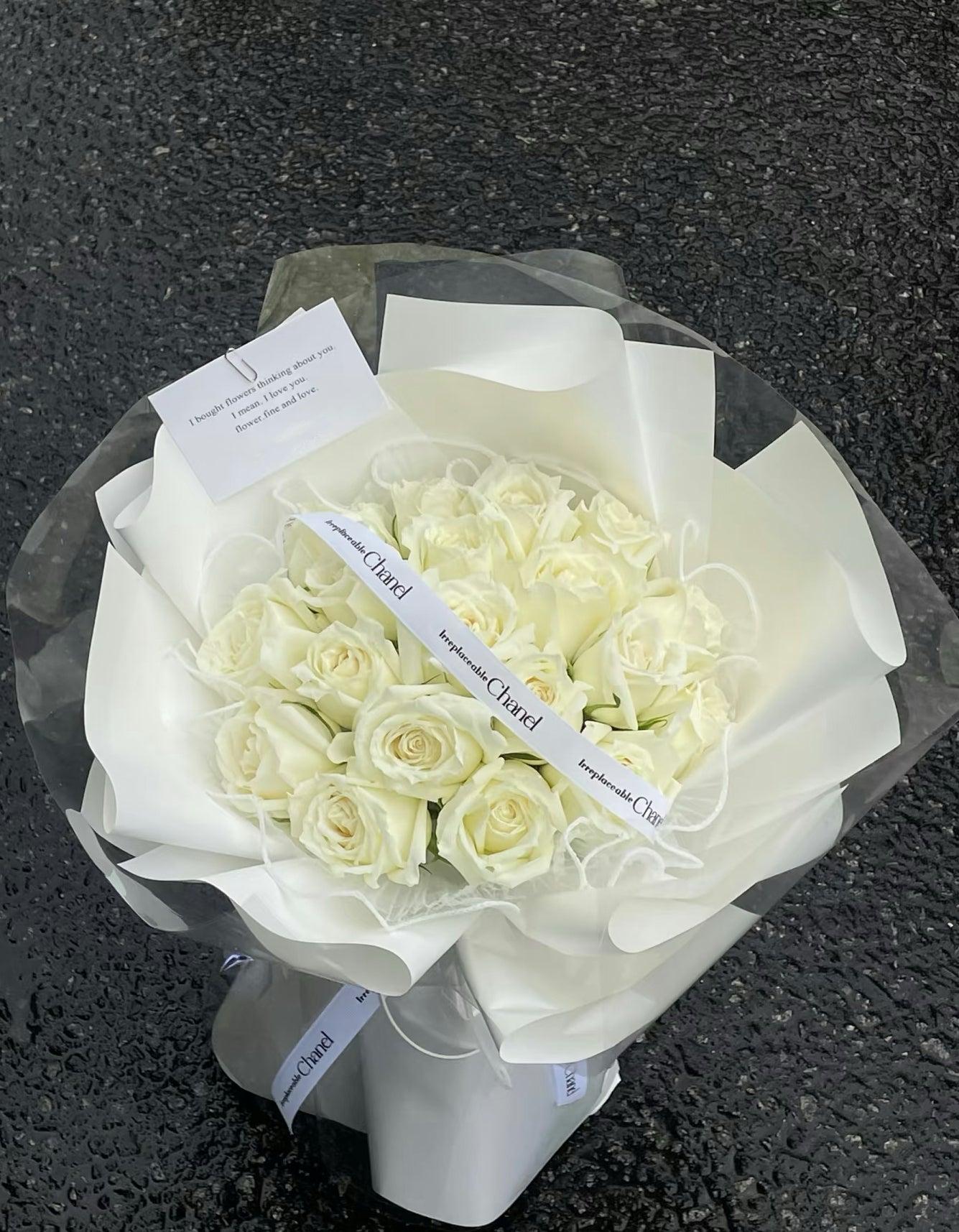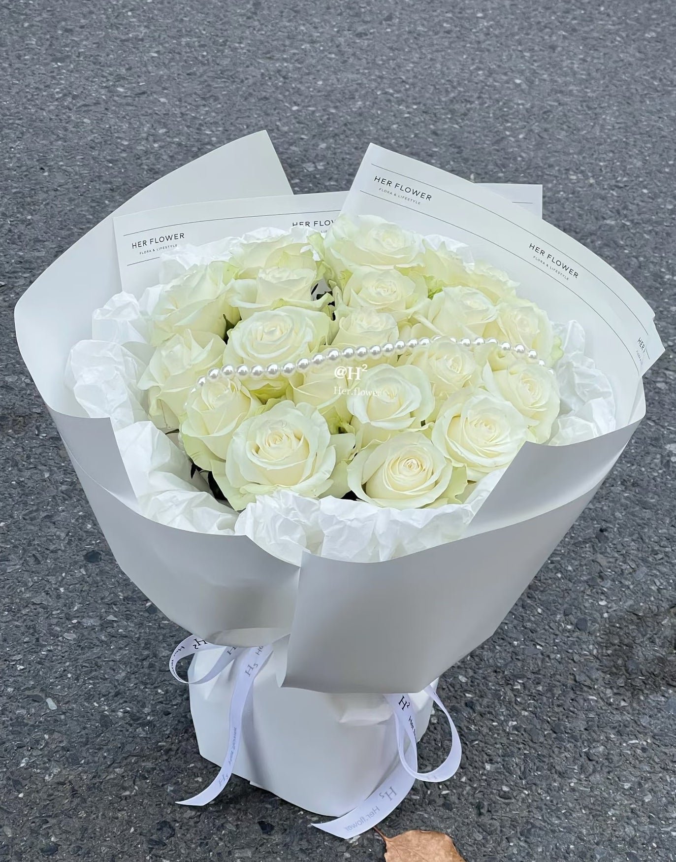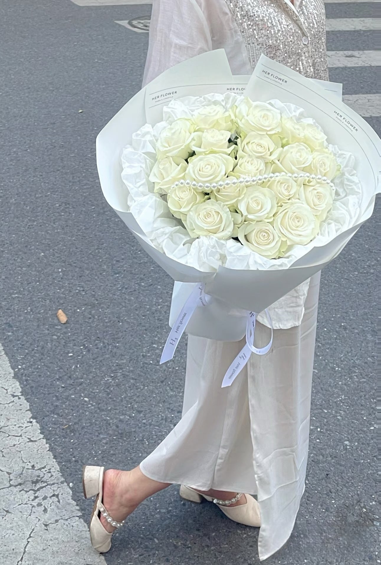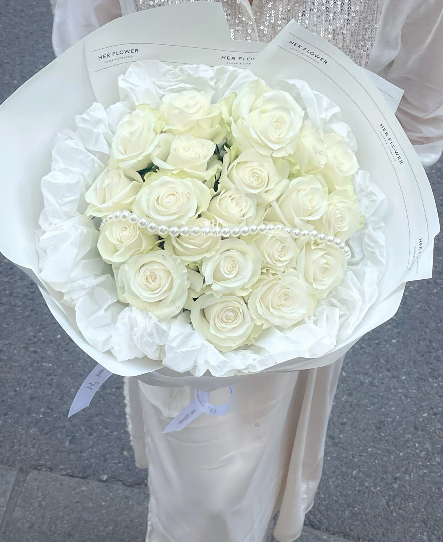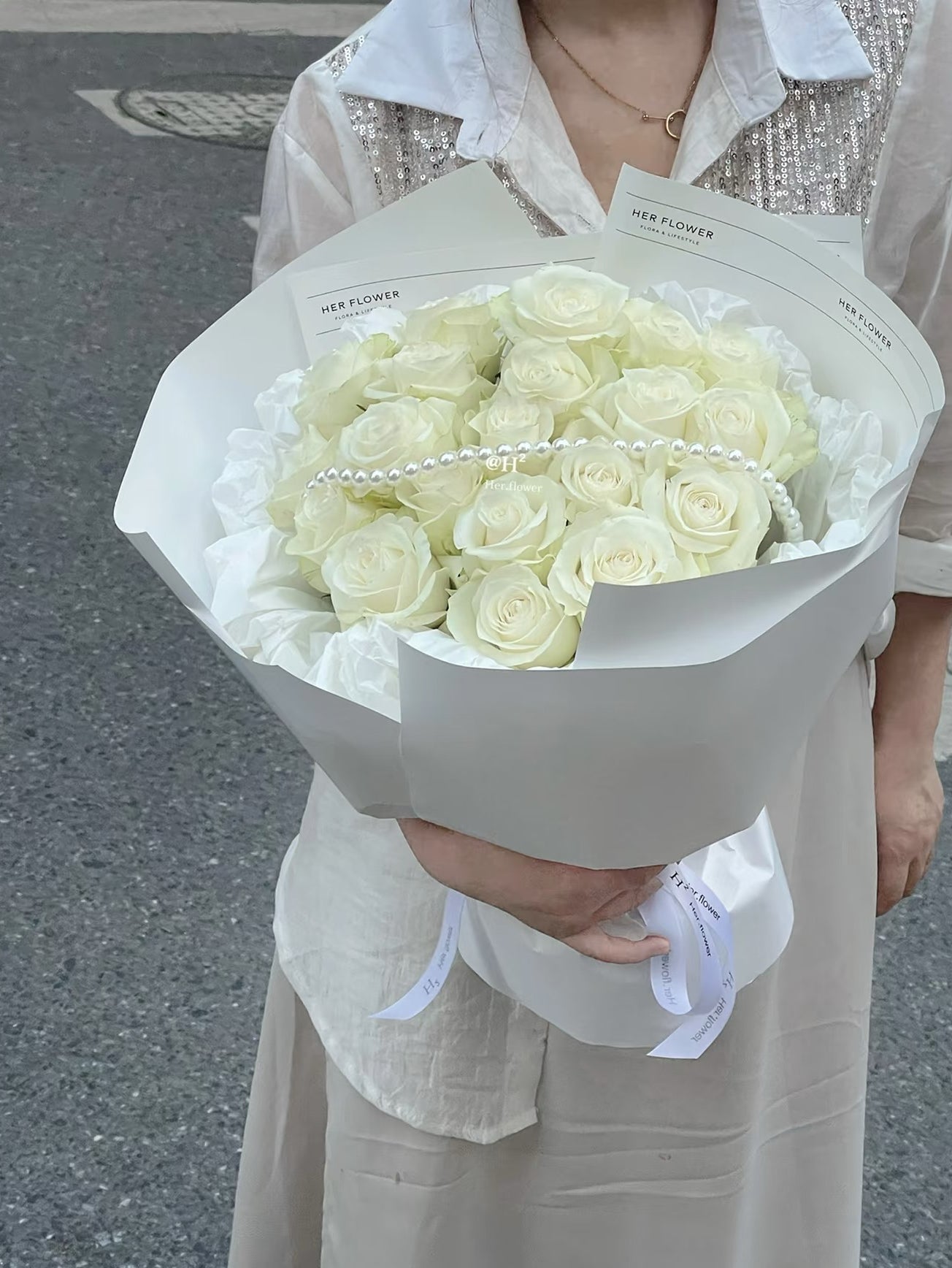 Under the hush of twilight, where moonlight softly touches the earth, Moonlight Promise whispers of eternal devotion. A circle of pure, tender pristine white roses cradled in folds of delicate paper and crowned with a string of pearls. Each bloom carries a vow unspoken, a promise kept between two hearts that find each other again and again beneath the same moon.